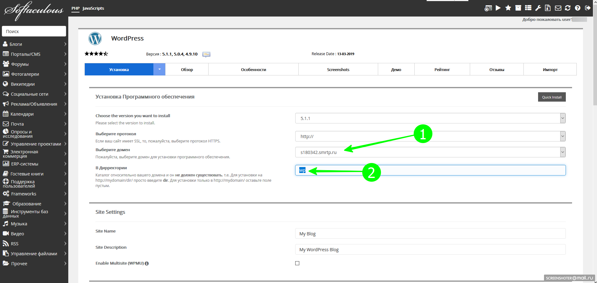 3. Выберите домен, в директорию которого будет производиться установка (важный момент - непосредственно перед началом установки все файлы в выбранной директории будут удалены, по-этому если там есть ценные данные, то сделайте их бэкап заранее). Поле «В директории» лучше оставить пустым, чтобы файлы сайта разместились в корне папки выбранного домена, иначе они будут размещены в поддиректории «wp» в той же папке