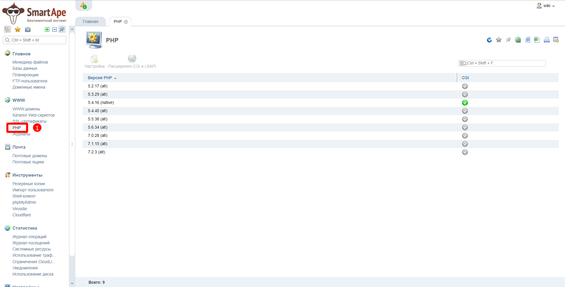 После чего выберете версию для которой нужно будет производить действия и нажмите кнопку «Расширения CGI и LSAPI».