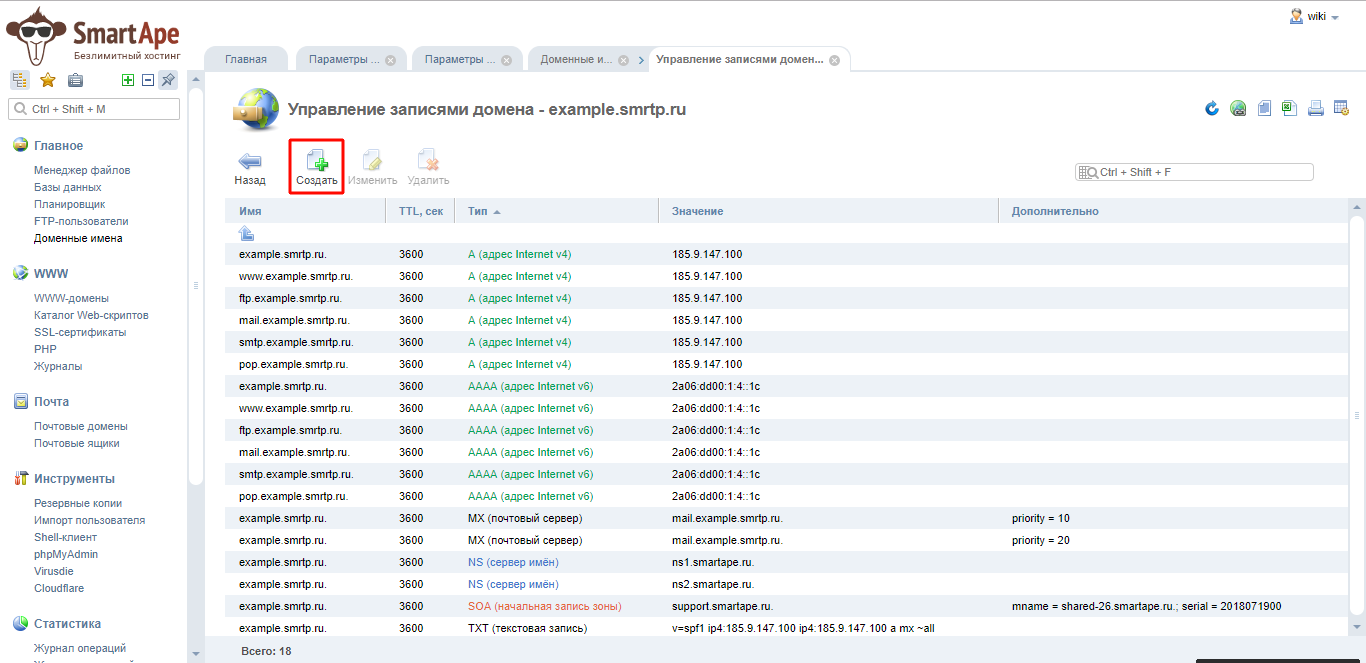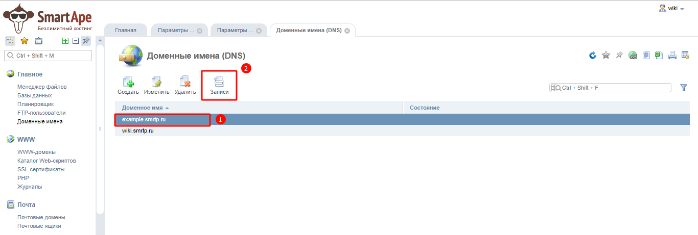 Вам нужно выбрать домен для которого необходимо создать записи, после чего нажать на кнопку «Записи».