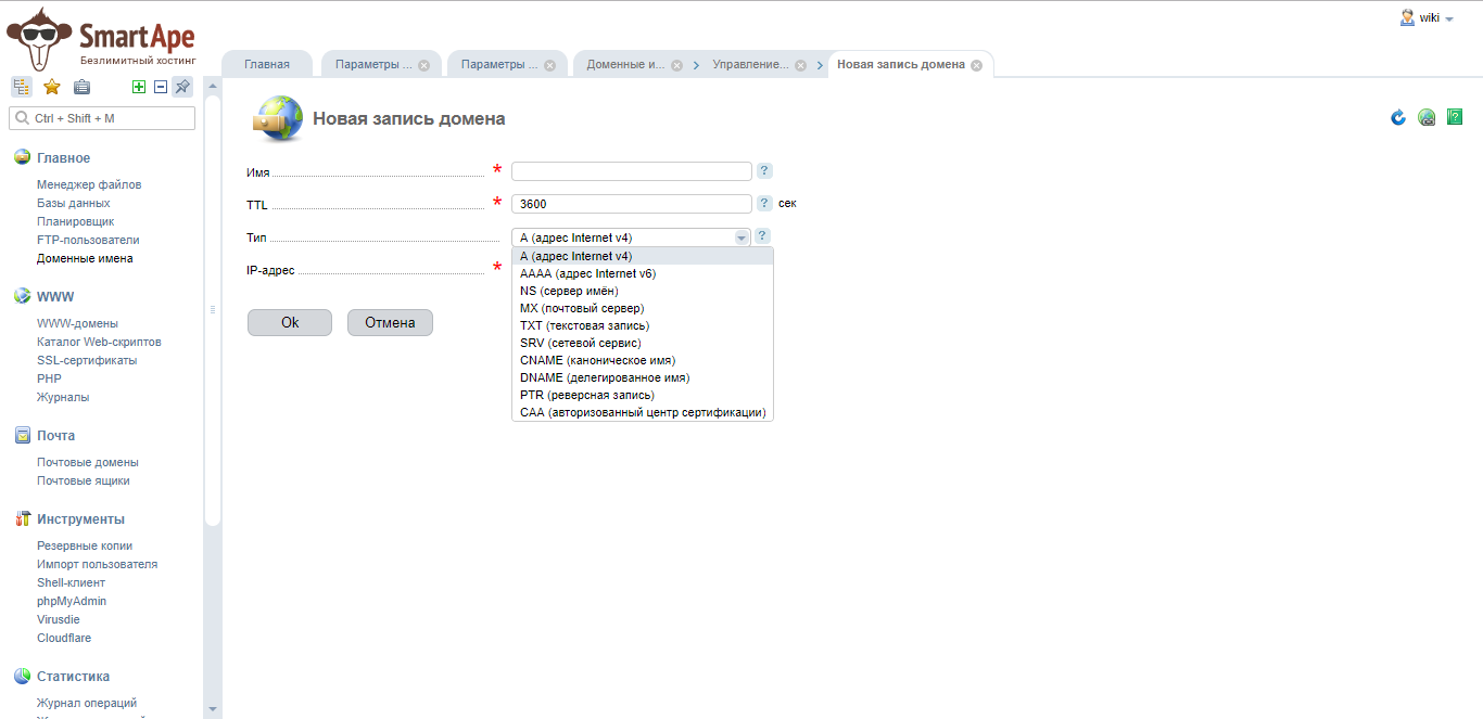 Перед вами откроется окно создания записи, в котором вам нужно будет сначала выбрать «Тип» записи а затем ввести остальные параметры. Поля отмеченные * обязательны к заполнению.