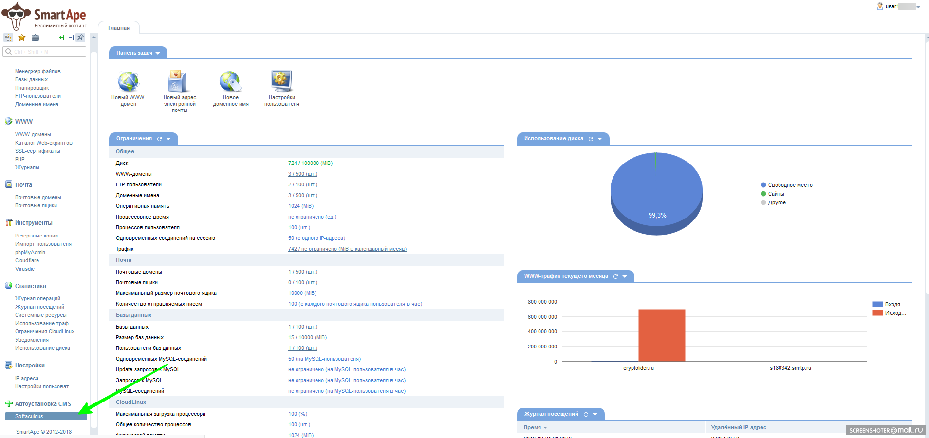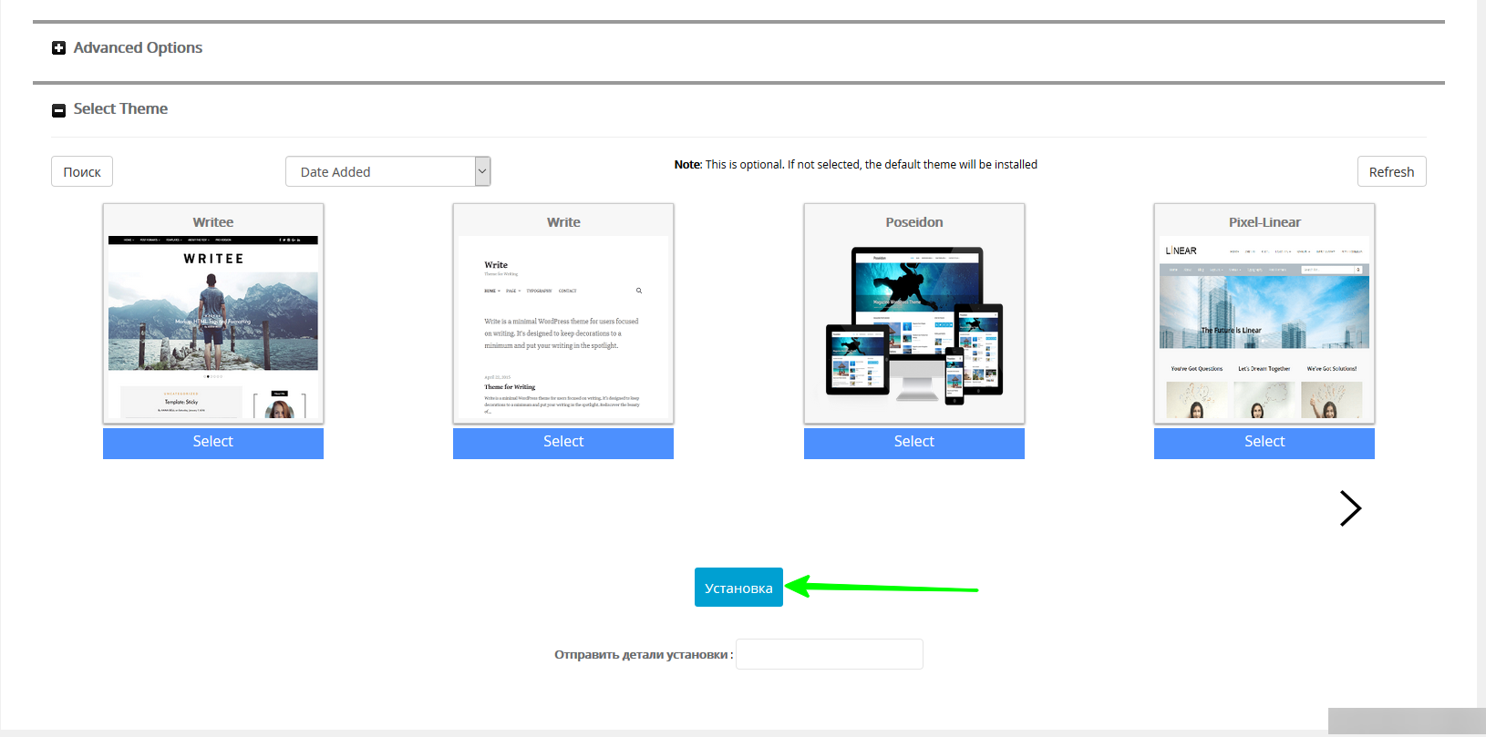 5. По завершении выбора нужных параметров нажимаем кнопку «Установка» внизу страницы, будет выполнено копирование файлов и создание БД. После чего Вы сможете открыть Wordpress-сайт по имени Вашего домена, выбранного Вами в пункте 3.