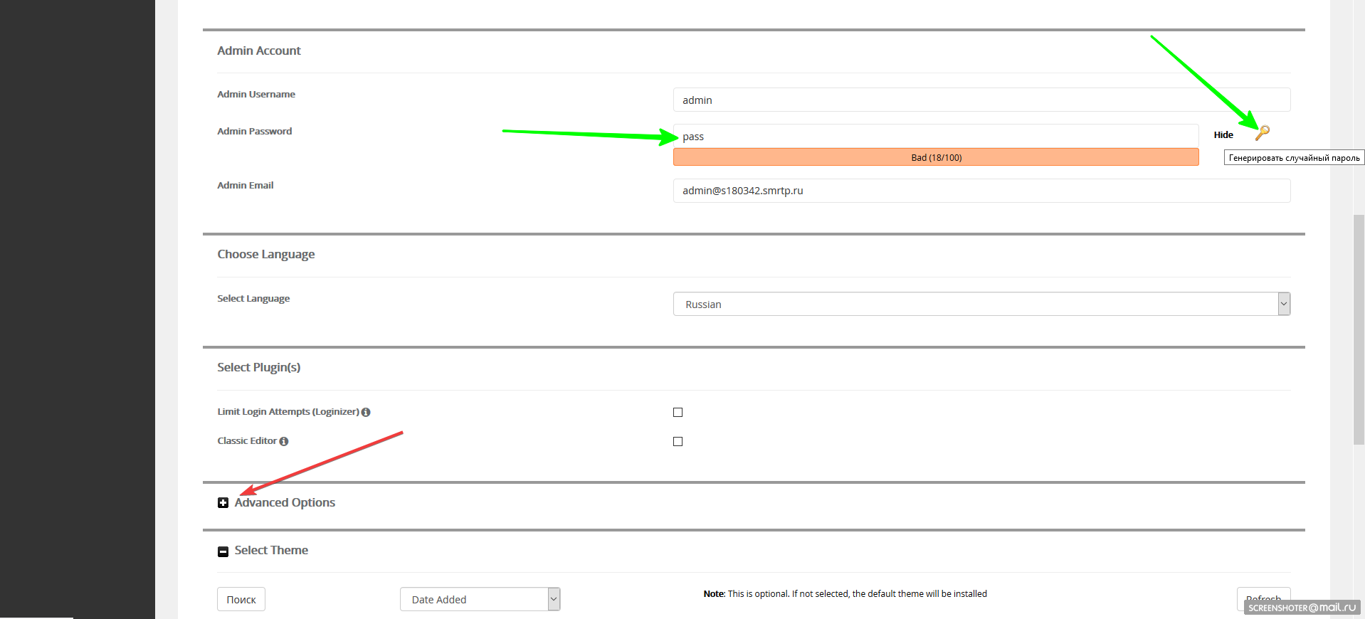 4. В разделе «Admin Account» Вы можете задать логин и сгенерировать безопасный пароль для учётной записи администратора Wordpress-сайта. Также если требуется, то в разделе «Advanced Options» Вы можете задать параметры для базы данных