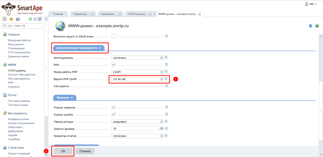 После чего в открывшимся окне редактирования www-домена пролистать страницу до «Дополнительные возможности» где будет выпадающий список «Версия PHP LSAPI» в котором вы сможете выбрать необходимую вам версию PHP.