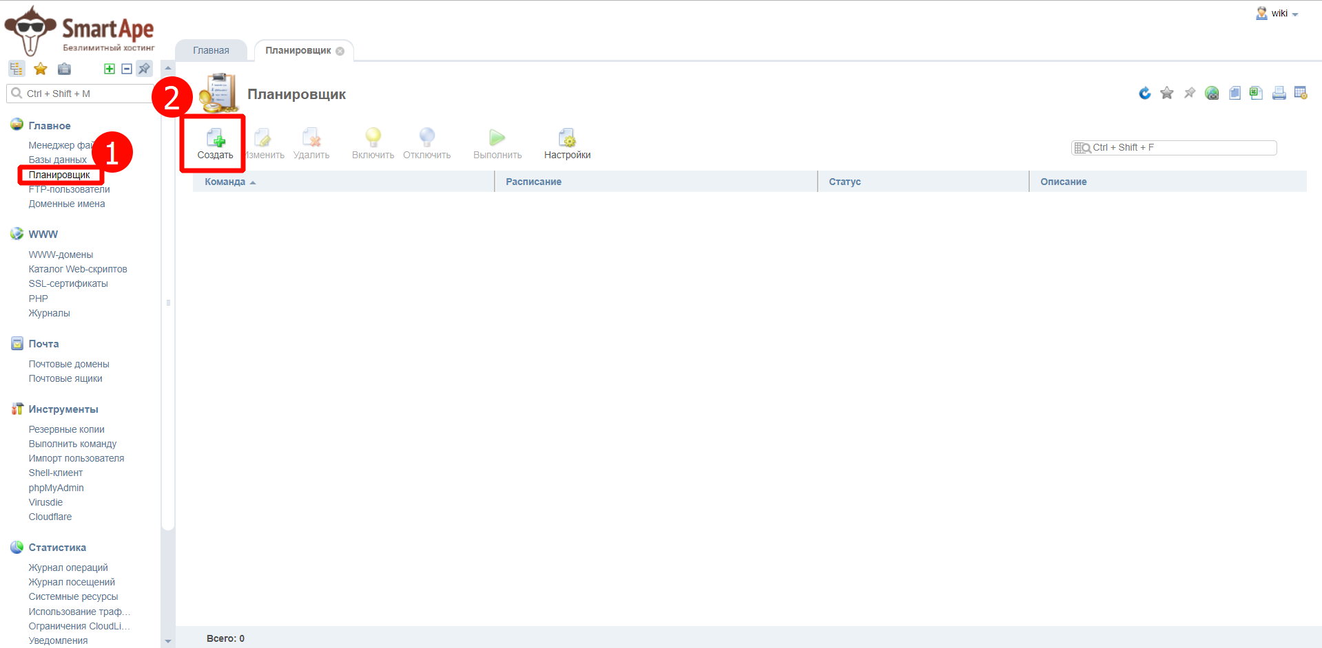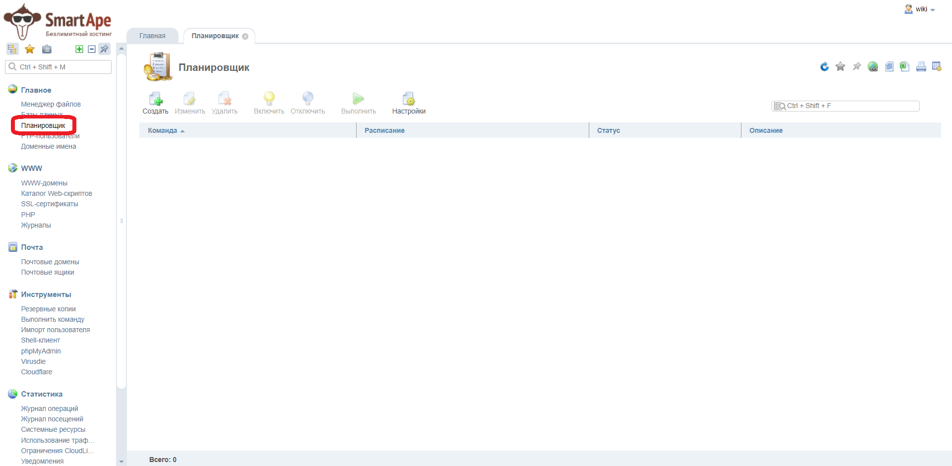 Вам необходимо перейти в панель управления хостингом, к примеру https://shared-24.smartape.ru/ispmgr (ваш аккаунт может размещаться на другом сервере) (не путать с биллингом/личным кабинетом который находится по адресу https://cp.smartape.ru/billmgr) и нажать в левом меню пункт «Планировщик»